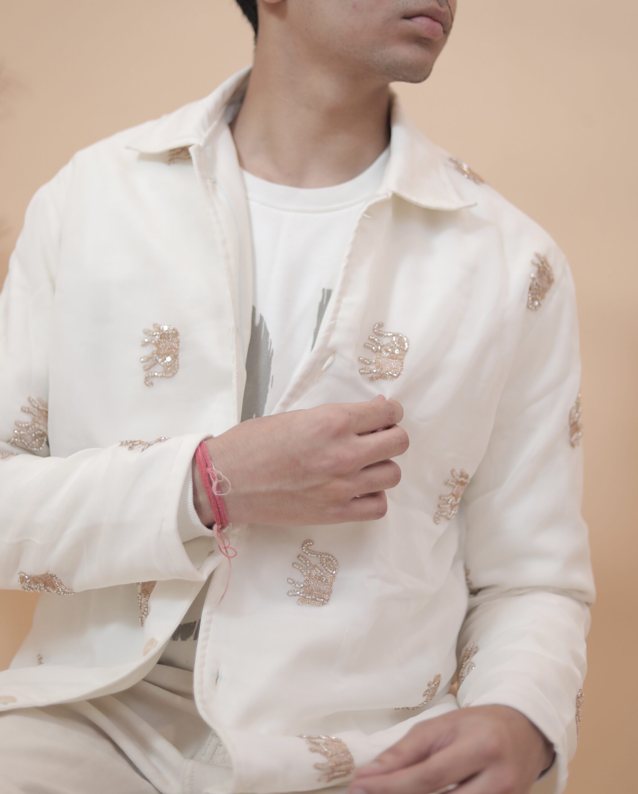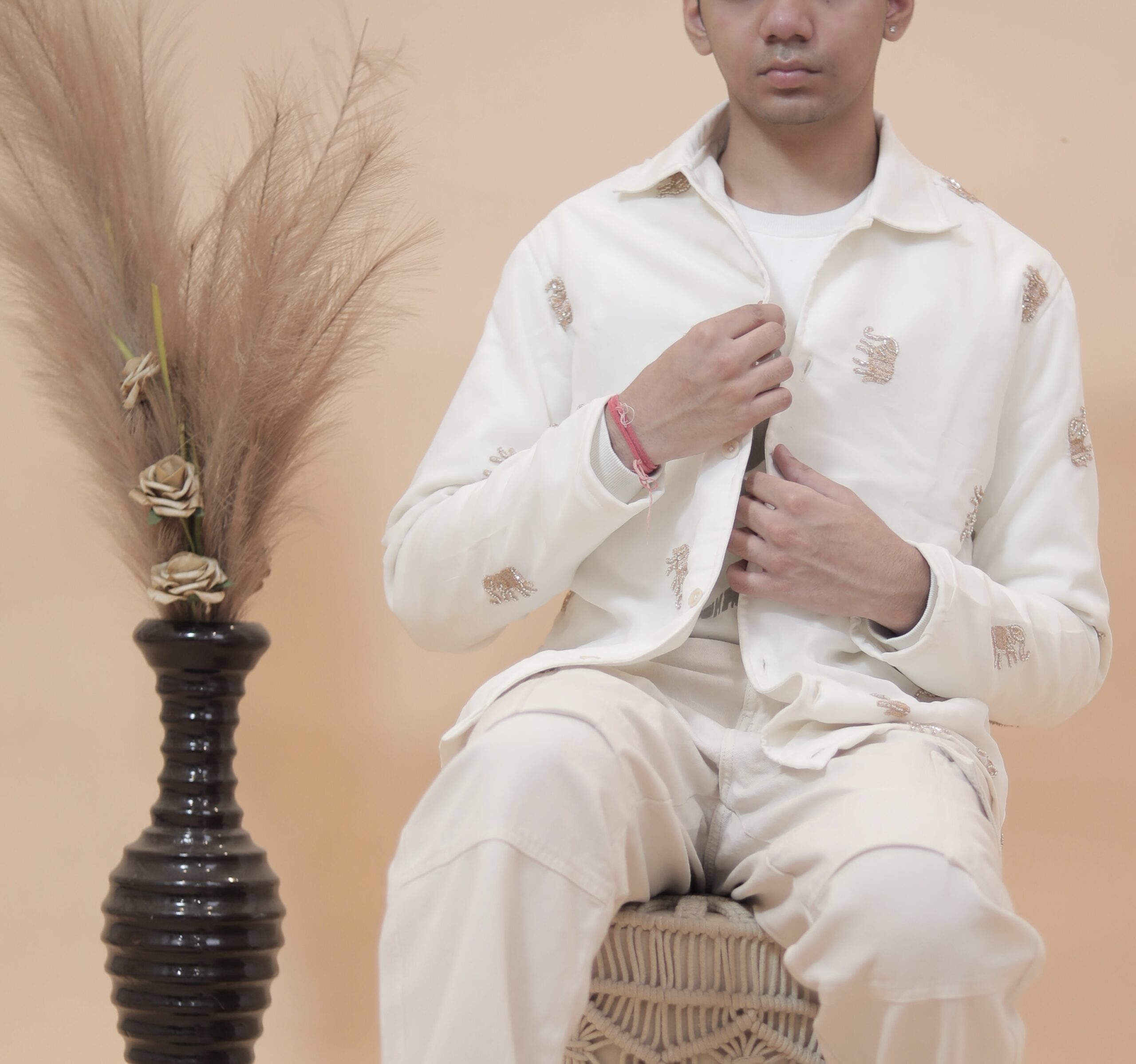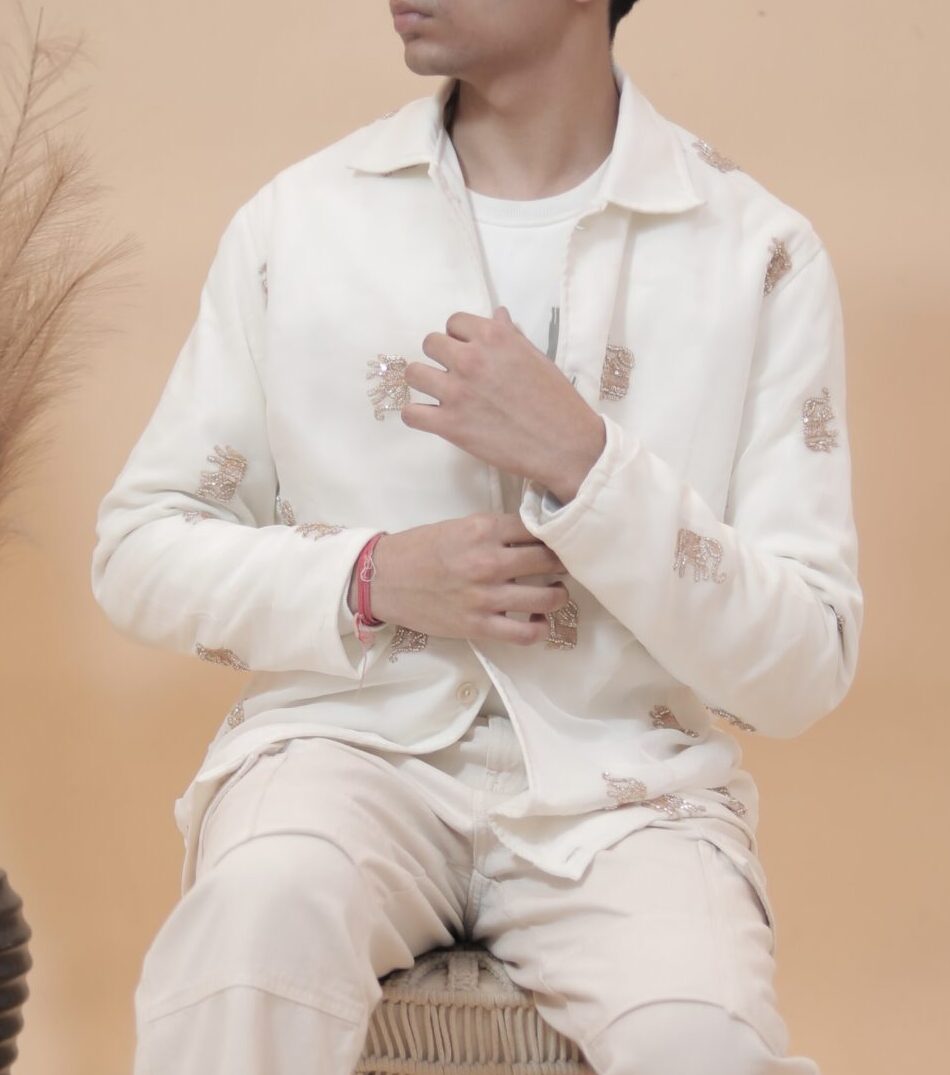 Sparsh is more than just a winter jacket. It’s crafted with premium breathable white cotton but with a warm inner lining of woollen fabric, making it extremely cozy and comfortable for winters. Its exclusiveness lies in the handcrafted Jardosi embroidered patchwork that reflects royal Indian artistry in a contemporary silhouette. It’s a perfect blend of streetwear fashion with heritage luxury.