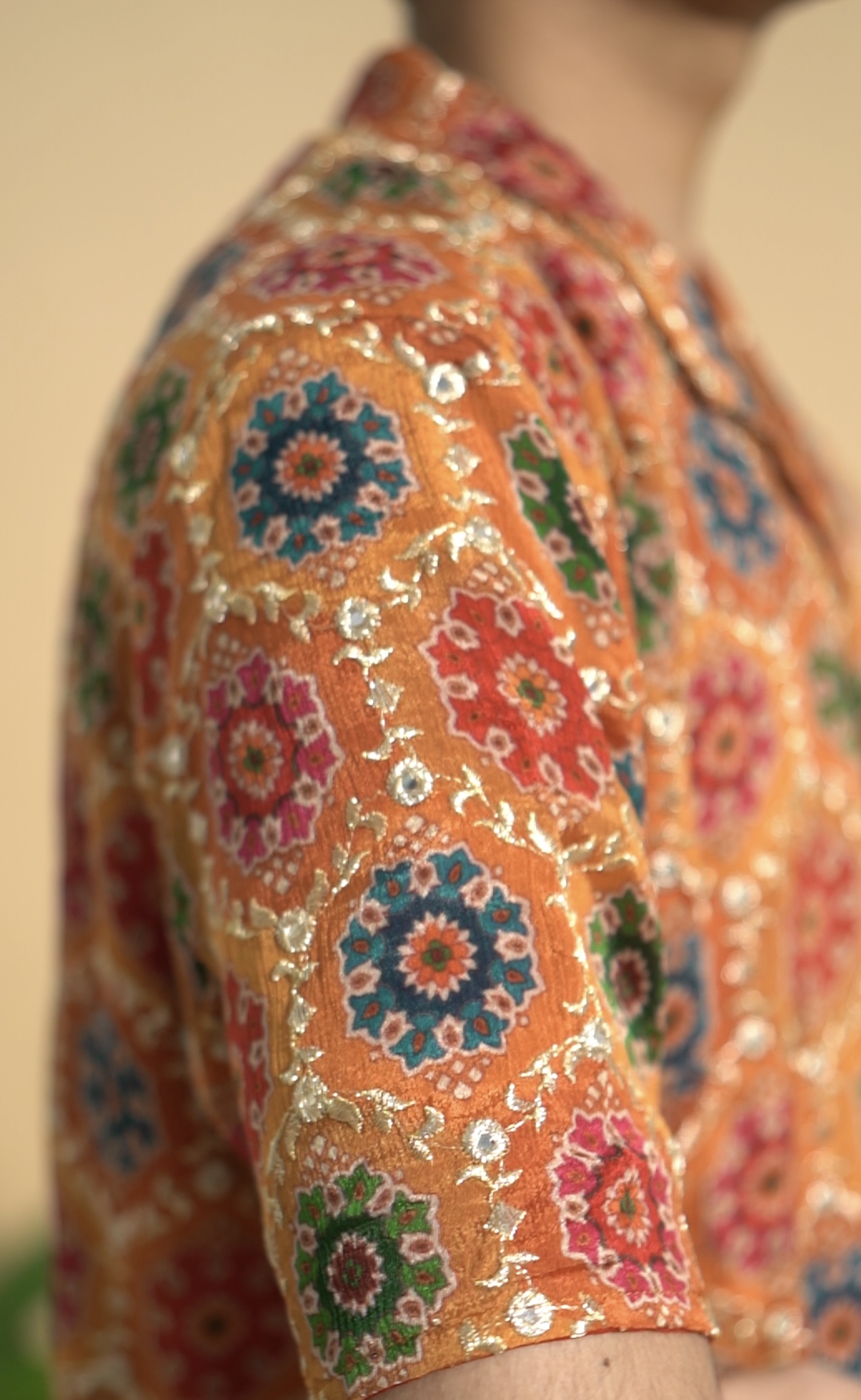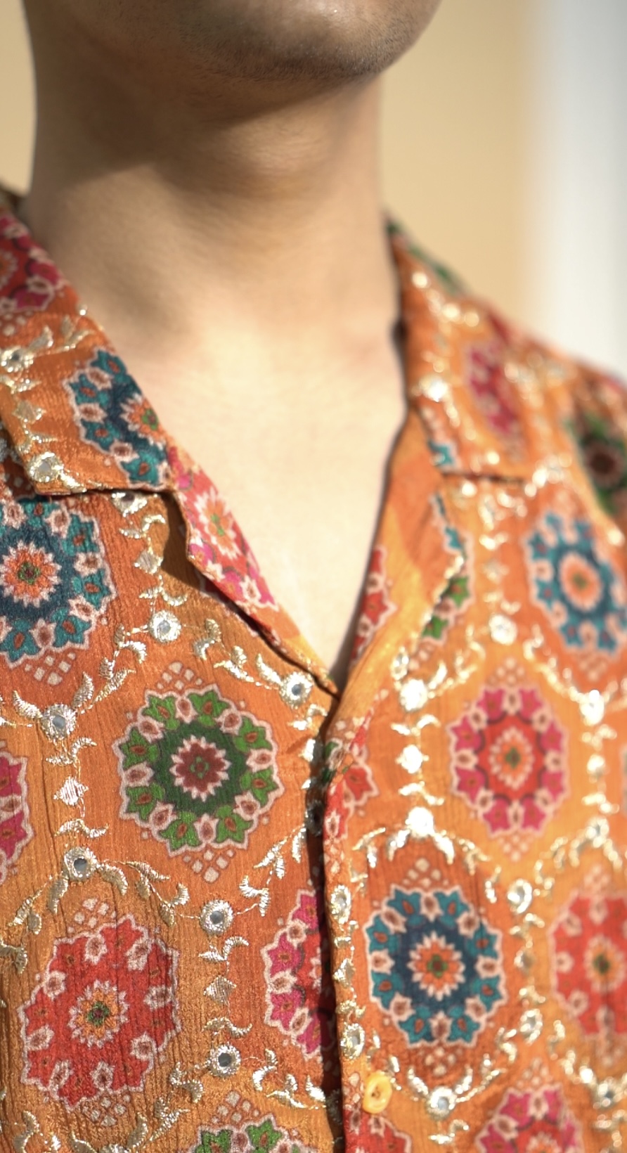 Maya is the perfect example of Indian traditional attire with western clothing. Being handcrafted in Varanasi, this oversized shirt glows in a rich yellow and mustard hue being adorned with intricate Jardosi embroidery and reflective mirror work, each stitch narrating the artistry of karigars. It’s a piece as versatile as it is striking the spotlight for this ongoing festive season.